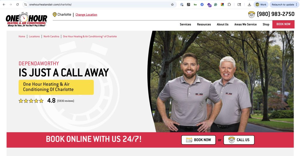 I looked at One Hour Heating & Air Conditioning® of Charlotte, NC. They are a massive player: 54 years in business, 4.8 stars on Google, and they have a trademarked slogan: “DEPENDAWORTHY IS JUST A CALL AWAY.”